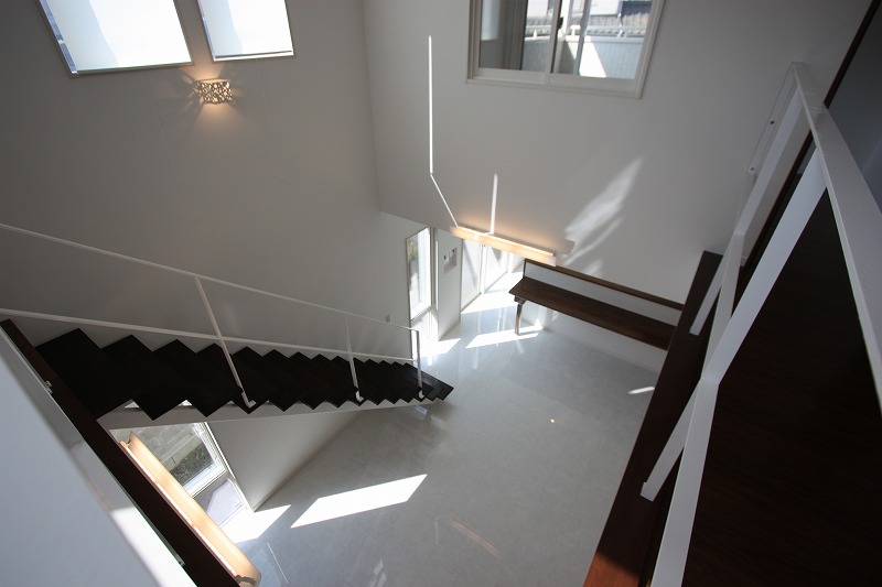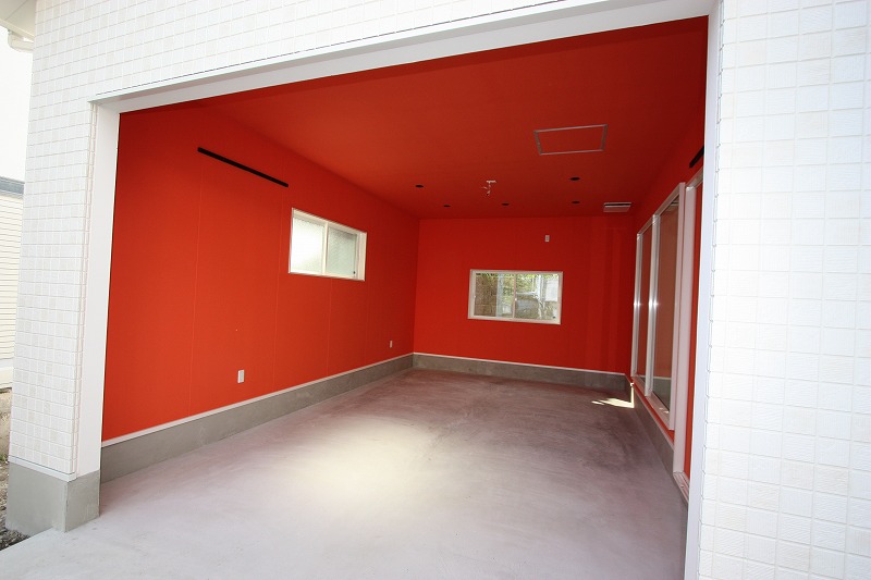 外観、内観とも白を基調としたデザインで高級感のあるお家です。ガレージや玄関ドア、キッチンなどにアクセントとなる赤系の色を選び、魅力的な印象を与えます。お施主様が直接施工したデザイン階段と吹き抜け、ガレージがあることで、どこか素敵なお店にいるかのような雰囲気になります。