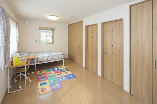 鹿児島ツマガリハウスオリジナル住宅GLAD30。自然豊かな風景とスッキリとした外観が魅力的。水廻りをまとめて家事をしやすい動線はお母さんの味方。限られたスペースで広々とした部屋を確保。2帖のウォークインクローゼットで洋服をたっぷり収納。床やドアを明るい色でまとめることで、開放的な空間を演出。