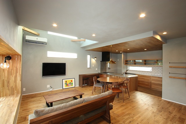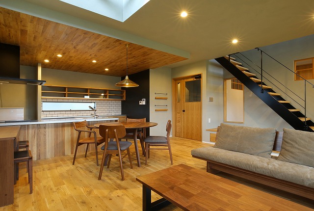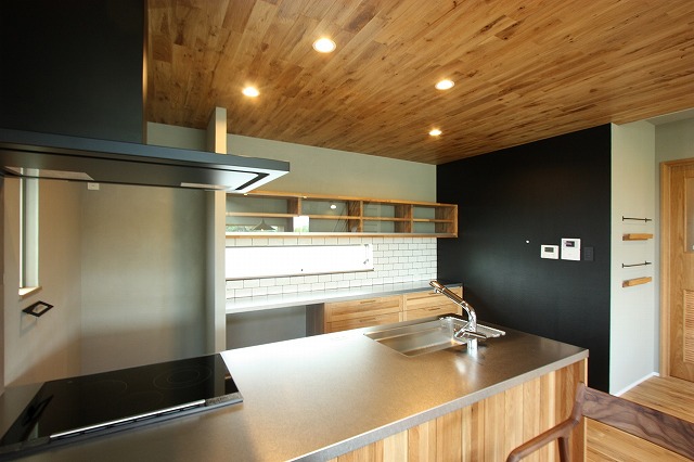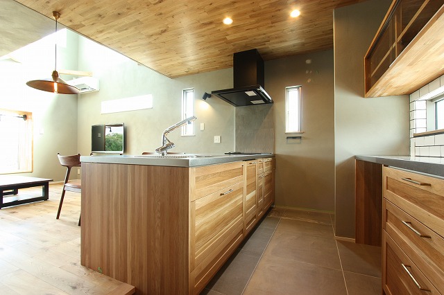 無垢の床に合わせて、無垢のキッチンを採用し、シックな雰囲気の中に無垢の柔らかい雰囲気を取り入れました。