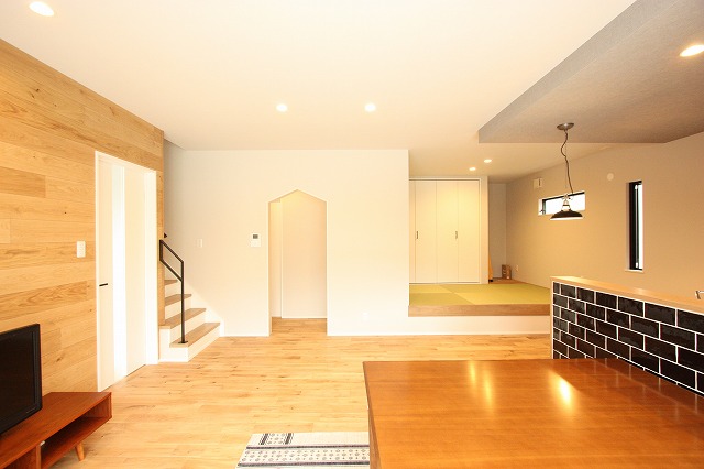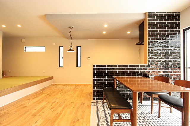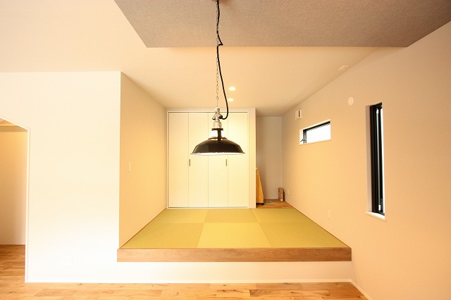 LDKとあわせて小上がり畳コーナーを設けました。くつろぎのスペースとして、腰掛けてソファ代わりとして等配置を考えて設計。