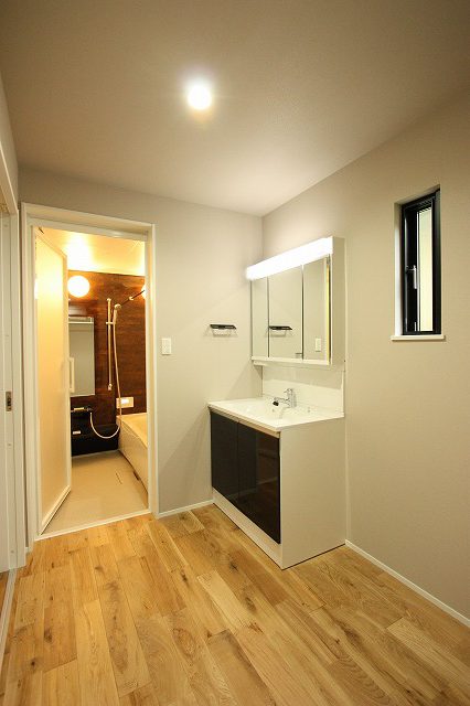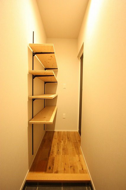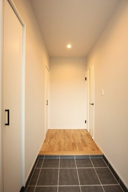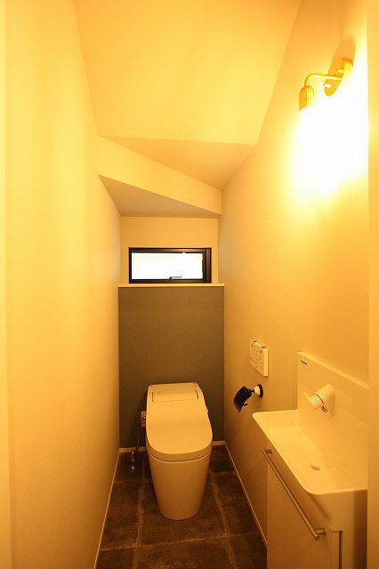照明やペーパーホルダー・表札・ポストなどの小物をtool DECOで提案しました。小物を変えるだけでお家の雰囲気が変わり、床と壁の1面に木目を取り入れることで、1階はナチュラルテイスなお家に仕上げました。